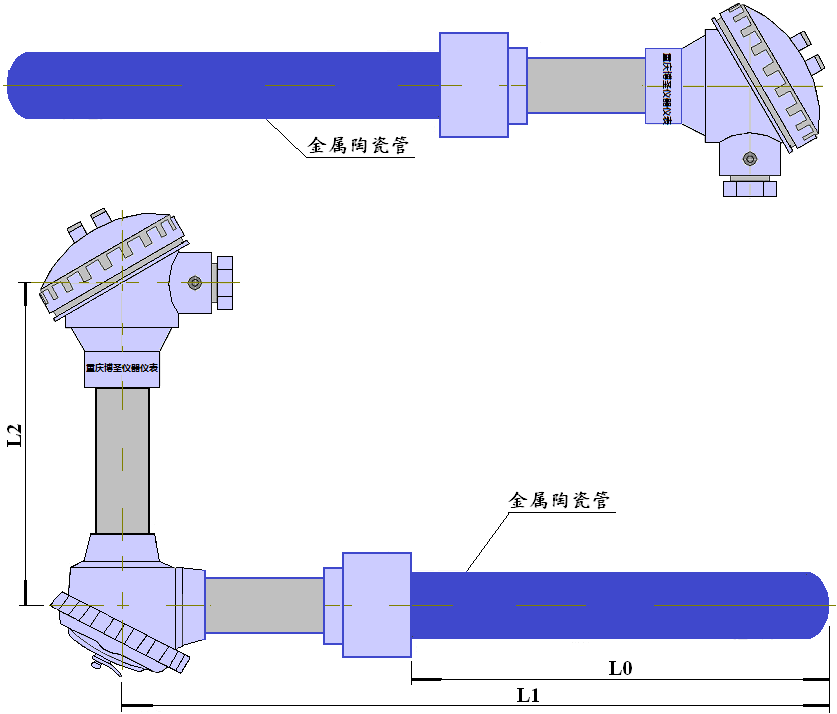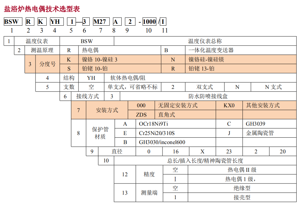 熔鹽液體特別是在強電場的作用下,對浸入式熱電偶金屬外套管具有極強的腐蝕性,一般的高溫合金都很快被腐蝕,而陶瓷套管的致密性很差,鹽液容易滲透進去,對 熱電偶偶絲造成腐蝕。BSWR□YH 鹽浴爐專用熱電偶,采用陶瓷和特種金屬混合體特制的一種金屬陶瓷管,此種金屬陶瓷管耐低、中、高溫熔鹽液腐蝕,抗熱震性好, 高使用溫度 1280℃,可靠性高,使用壽命長。在 1280℃ 的熔鹽中連續(xù)試驗 1000 小時不開裂,在 1280℃至室溫急 冷急熱循環(huán)試驗 60 次不開裂,是目前耐鹽液腐蝕的好材料,已成功應(yīng)用于熱處理行業(yè)高溫鹽浴爐的溫度連續(xù)測 量,效果非常好。由于金屬陶瓷管采用粉末壓裝成型,再在高溫下燒結(jié)成型,故目前的尺寸只有φ23 ×300 和φ23×400。整支熱電偶采用裝配形式組裝而成,偶芯可拆卸取出,以滿足不同公司的工藝要 求定期效驗。
