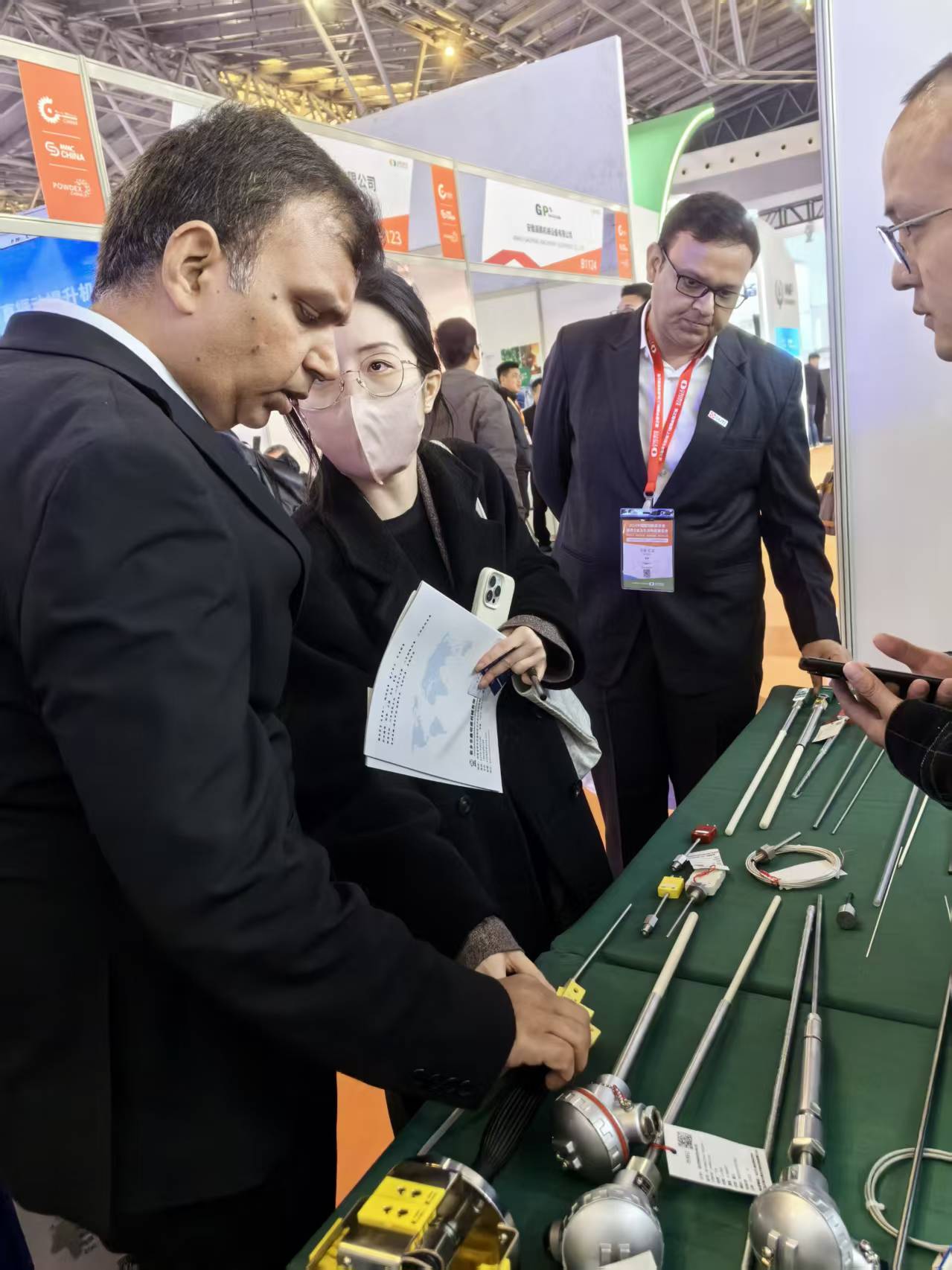 展會期間,博圣儀器儀表的B1209展位持續(xù)迎來行業(yè)觀眾駐足:國內(nèi)先進(jìn)陶瓷企業(yè)、裝備制造商的技術(shù)負(fù)責(zé)人,圍繞 “陶瓷生產(chǎn)溫度精準(zhǔn)調(diào)控” 與現(xiàn)場團(tuán)隊深入研討;同時,多位國際客商也專程到訪展臺(如圖中海外客戶),重點咨詢高溫傳感器的定制適配方案,現(xiàn)場交流覆蓋產(chǎn)品性能、場景適配、批量合作等多維度。